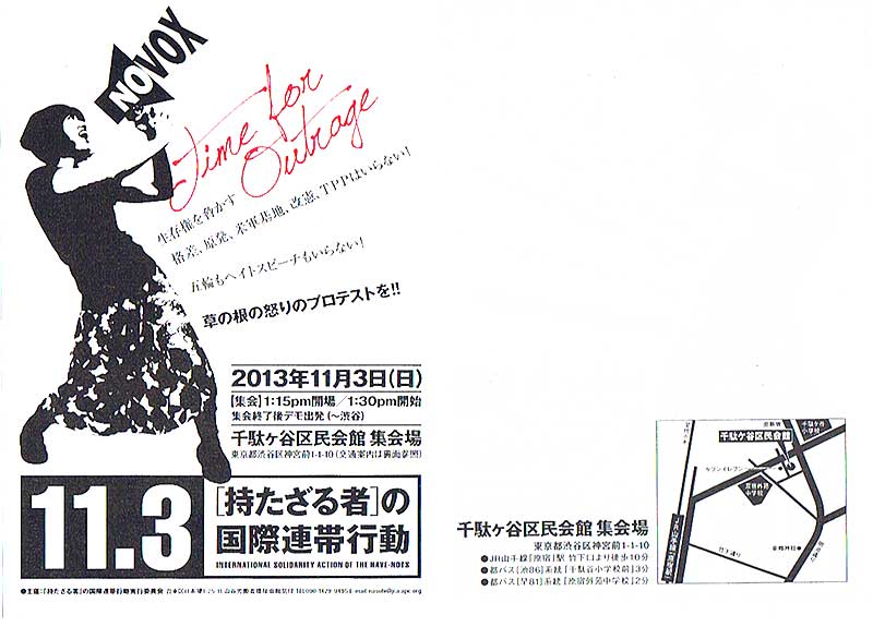 10・13で、私たちと行動を共にしていただいた「持たざる者の国際連帯行動」の皆様が、今年も11・3行動を闘われます。とりわけ今年は原発再稼働、国家秘密法、TPP、それにオリンピック招致をテコにした野宿者排除や少数派への治安弾圧と環境破壊、改憲・軍拡、差別排外主義の跋扈など、安倍政権による全面展開ともいえる総攻撃の中、課題は多く、多くの人が垣根を超えて幅広く手を結ぶべき、重要な位置づけとなります。私たち反原発ジグザグ会も参加します。多くの皆さんの参加を呼びかけます。